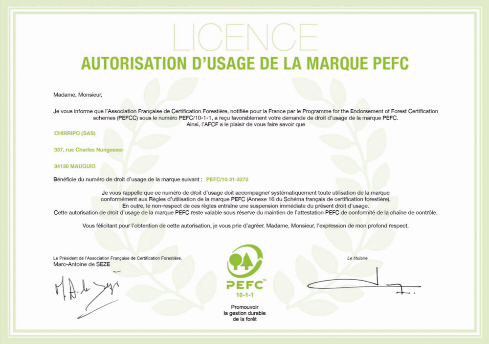 CHIRRIPO EST CERTIFIÉE PEFC depuis 2016